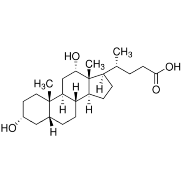 O Ácido Deoxicólico (CAS: 83-44-3) é geralmente conjugado com glicina ou taurina e atua como detergente na emulsificação de gorduras para absorção intestinal.