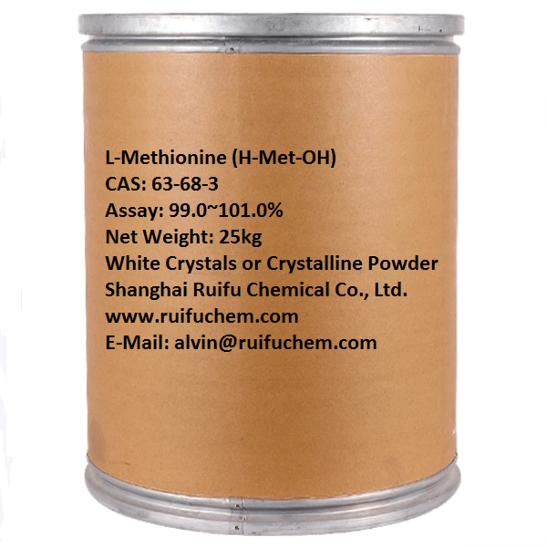 L-Metionina (H-Met-OH; abreviado Met ou M) (CAS: 63-68-3) é o isômero L-da metionina, um aminoácido essencial para o desenvolvimento humano. A metionina atua como hepatoprotetor. L-Metionina é usada para estudos bioquímicos. L-Metionina é usada nas áreas de medicamentos quirais, aditivos quirais, auxiliares quirais e similares, e é usada como fonte quiral para síntese quiral na indústria farmacêutica. L-Metionina pode ser utilizada na síntese de vitaminas medicinais, suplementos nutricionais e aditivos alimentares. L-Metionina é um dos principais componentes da infusão de aminoácidos e aminoácidos compostos. L-metionina tem função anti-gordurosa no fígado. Aproveitando esta função, as vitaminas medicinais sintéticas podem ser utilizadas como preparações de proteção hepática.